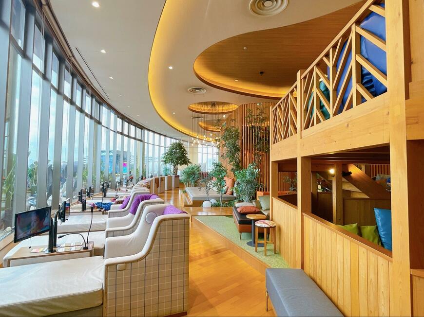 スパジャポ最大の魅力は、岩盤浴利用者専用の「ラウンジ」があること。リクライニングチェアはもちろん、おこもりにぴったりなBOX席やゆったり寝転べるソファ席など、多種多様の休憩スペースが用意されています。