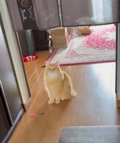 Xでたくさんの注目を浴びているのは、猫の女の子「エマ」ちゃん。向こう側の部屋から、険しい表情でこちらを覗いていますが……?