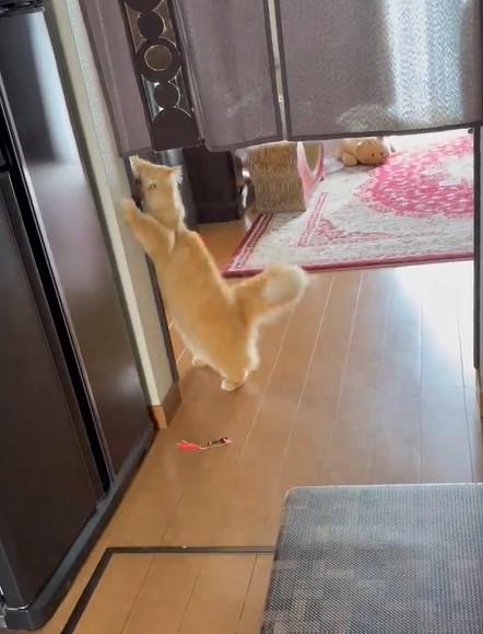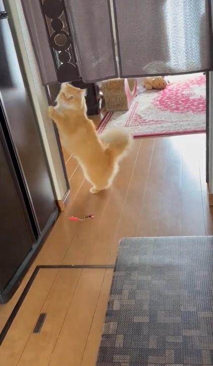 エマちゃんはこの直後「ンニャォ……!!」という声を発しながら、壁に手を添えて二足歩行を開始しました。素早く立ち上がり、小さな足で着実に前進する姿はまるで人間のようです。