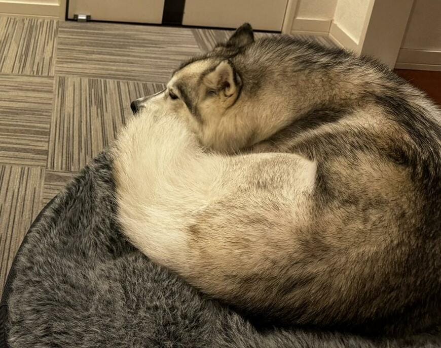 たくさんの注目を浴びているのは、シベリアンハスキーの「さくら」ちゃん。ふかふかの敷物の上で横になり、ヒーターの前でくつろいでいました。
