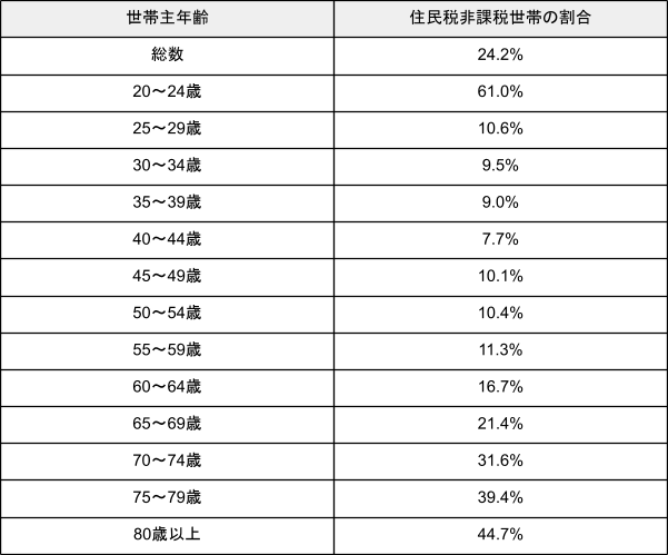 世帯全員が住民税非課税に該当する世帯を「住民税非課税世帯」といいますが、その割合は高齢になるほど高くなる傾向にあります。