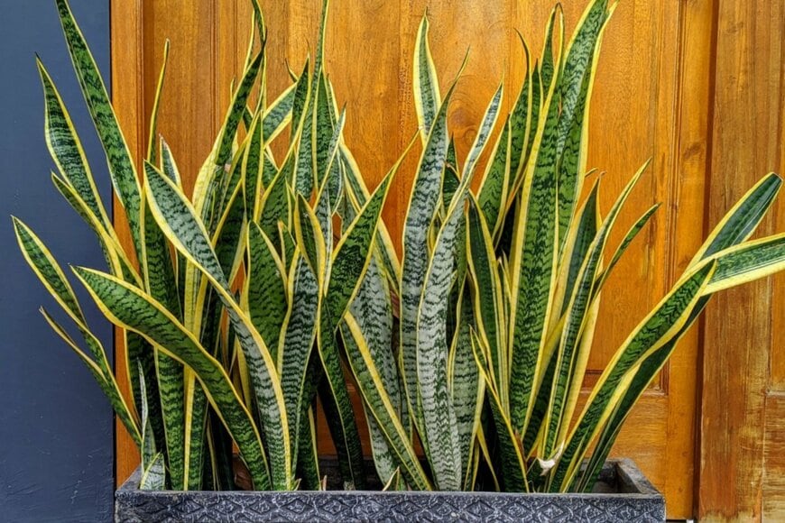 サンセベリアは緑に黄色のラインが鮮やか。細長い葉が立ち上がり、シャープでスタイリッシュな樹形が人気です。横に広がらないので狭いスペースにも飾れます。