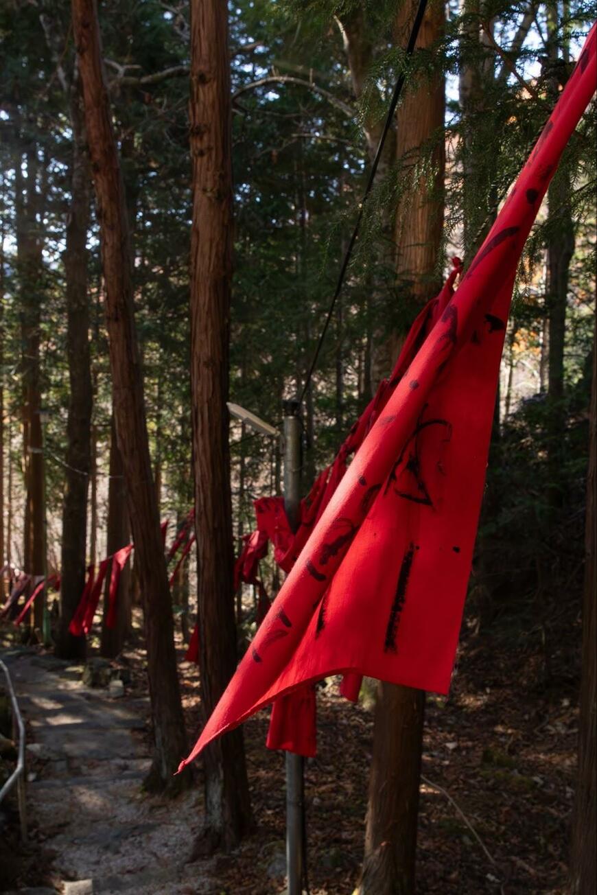そこには文字が書かれた赤い布が風に揺らめく、なんとも不気味な光景が広がっていました。