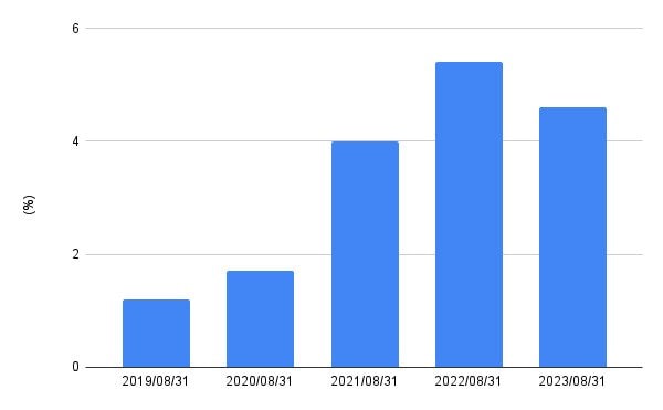 株主資本に対する純利益の割合を示すROE(自己資本利益率)は4.6%です。