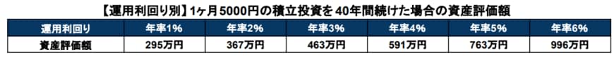 1カ月5000円の積立投資を続けた場合、運用利回り別にみた40年後の資産評価額は以下のとおりとなります。