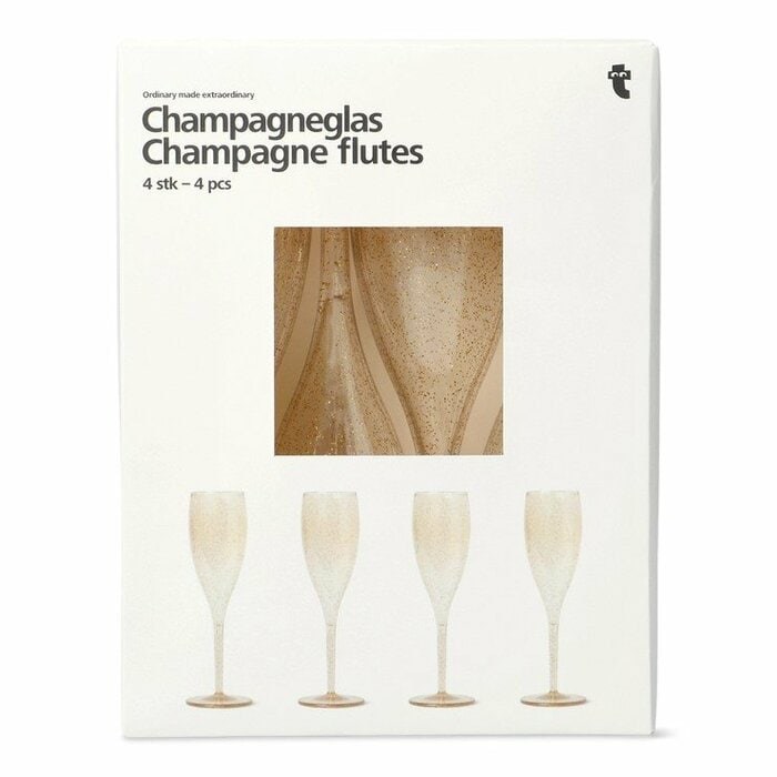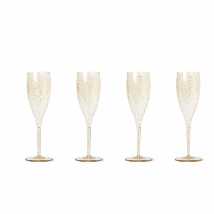 キラキラと星を散りばめたようなゴールドグリッターが華やかなシャンパングラス4個セット。おうちパーティで使えば、気分をゴージャスに盛り上げてくれるはず。