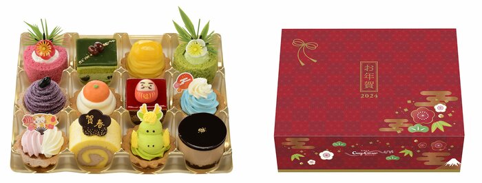 2024年の「スイーツ初め®」にぴったりなプチケーキのセットです。干支の”辰(たつ)”や初日の出をモチーフにしたタルト、だるまの形をしたチョコを飾ったラズベリーのケーキなど、12種のプチケーキをおせちのお重をイメージしたボックスに詰め合わせています。