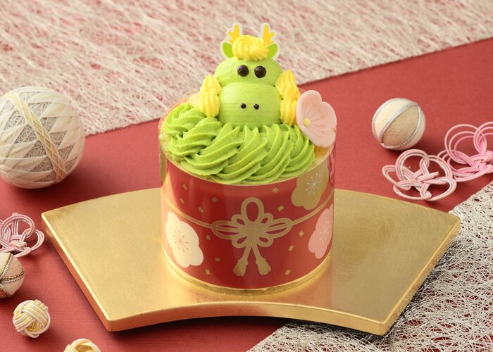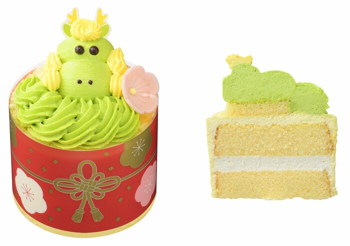 2024年の干支の”辰(たつ)”をモチーフにした縁起のいいお正月限定ケーキです。ヨーグルト風味クリームをスポンジでサンドし、青りんごクリームで辰の顔と体を表現。スポンジのふんわり食感と、2種類のクリームのさわやかな風味が楽しめます。