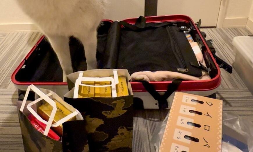 ママさんが旅行に行くことを察したのでしょうか。さくらちゃんはスーツケースに両足を「チョコン」と入れながら、自分も行くよ、準備はOKと言わんばかりに佇んでいます……!