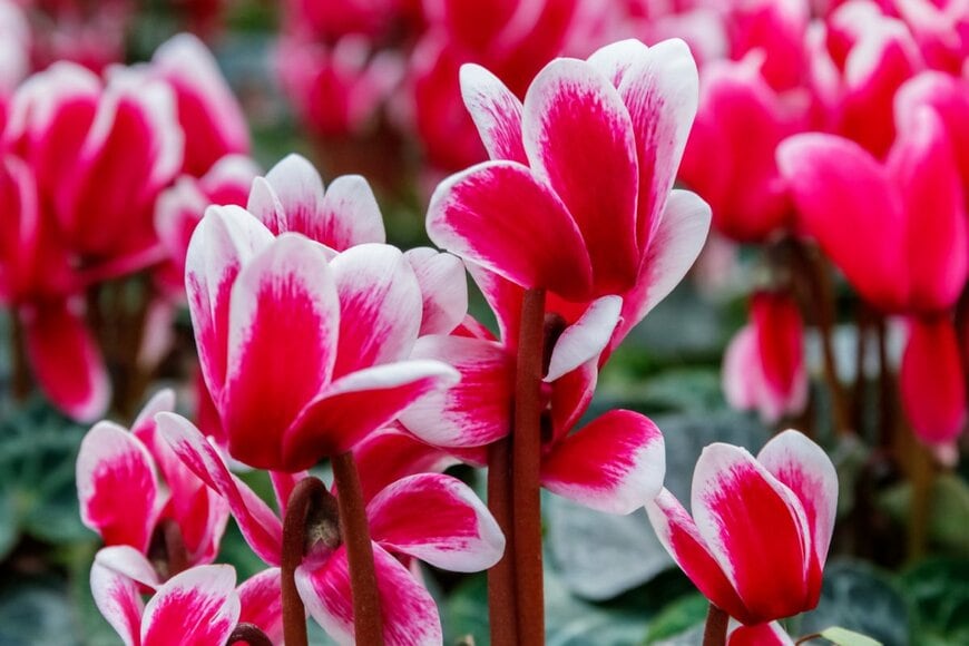 シクラメンは、冬の鉢花の代表的存在。赤やピンク、白や黄色など多彩な花色があり、一重咲きや八重咲き、フリンジ咲きなど花姿が違う品種もたくさん揃っています。