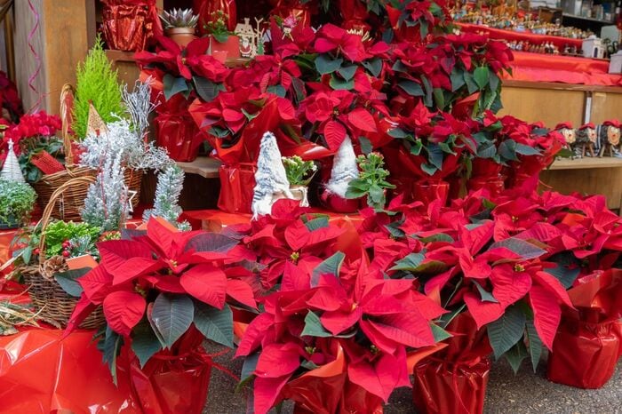 イタリアでは「クリスマスの星」という名で親しまれているポインセチア、クリスマスマーケットで購入する人も多数。