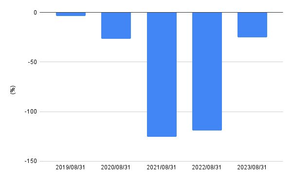 株主資本に対する純利益の割合を示すROE(自己資本利益率)は▲25.2%です。