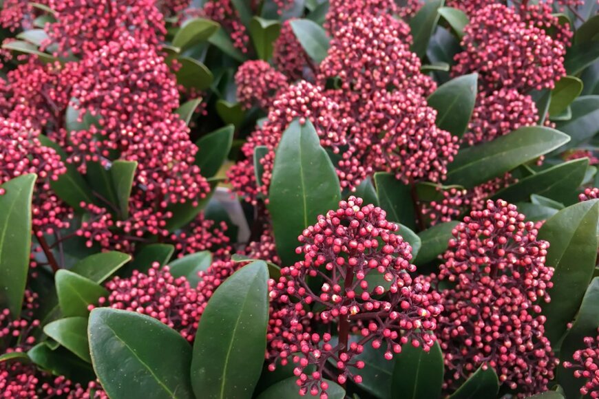 つぶつぶのツボミが可愛らしいスキミア。レッドやホワイトのつぼみが可愛らしく、クリスマスの寄せ植えにもおすすめです。冬の定番花のクリスマスローズなどにもよく合います。※参考価格:1000~3000円前後(3~4号ポット苗)