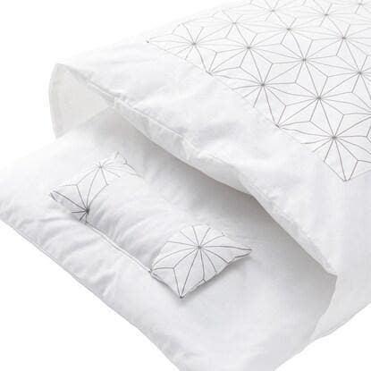 麻の葉模様の、和風な布団セットです。小さな枕がきちんとついてくるのも素敵なポイントです。