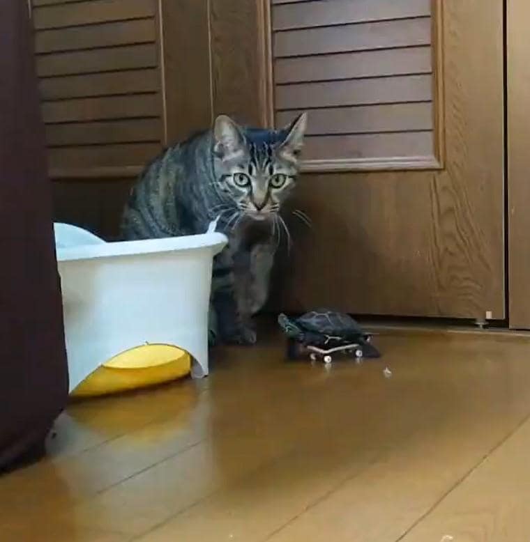 猫ちゃんのことが大好きすぎて、スケボーで煽り運転してしまう亀さんがX(旧Twitter)で注目を集めています。