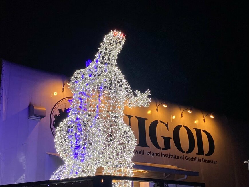 ゴジライルミネーションの奥では実物大のゴジラが怪しい光でライトアップされており、迫力満点ですよ。