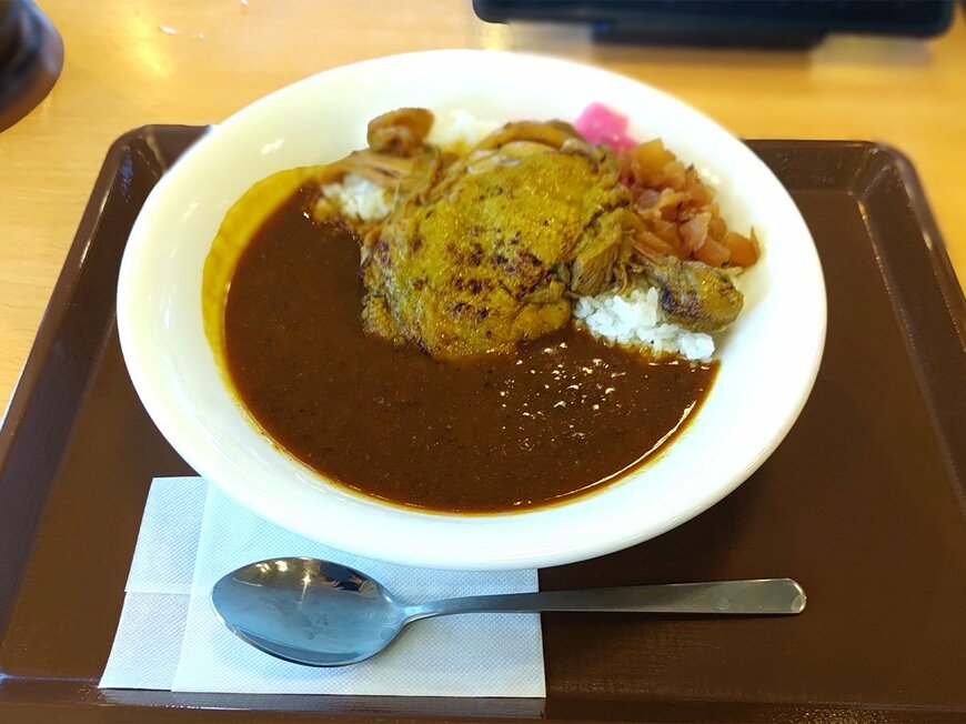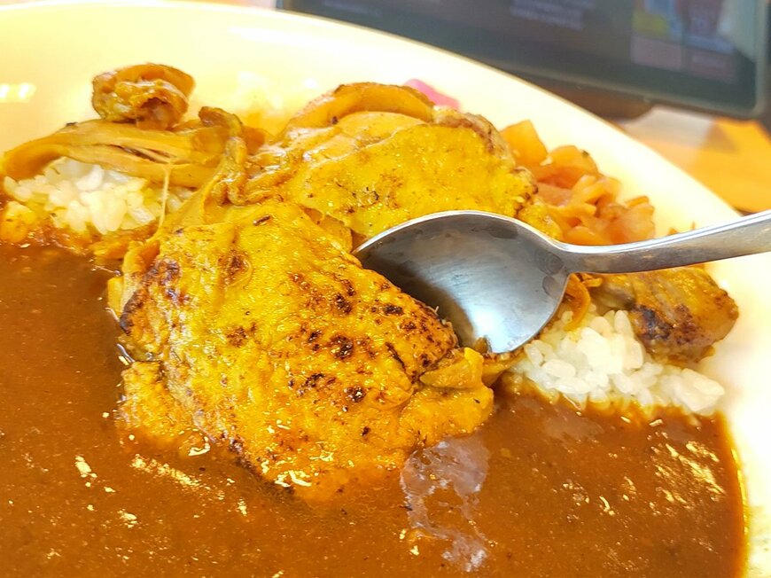 タッチパネルで注文してから数分後、「炭火焼きチキンカレー(並盛)」が到着。真ん中にはライスとルーをまたぐようにしてチキンが乗っています。メニュー写真で見るよりも大きく見えます。