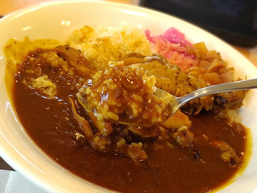 カレーは玉ねぎやトマトが溶け込んでいることもあってややザラッとした口当たり。見た目が濃い色をしておりピリ辛でコクがあります。
