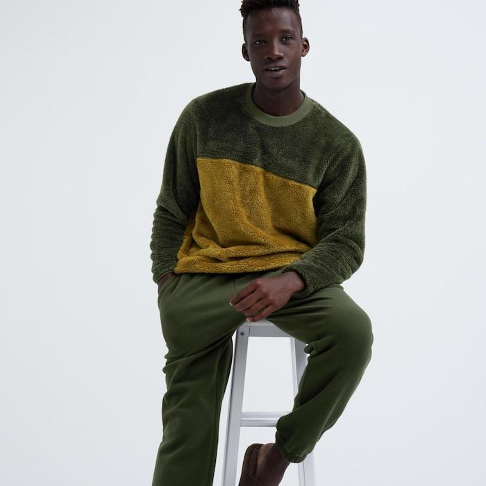 ユニクロのフリースセットは、ダークグレーとオリーブの2色展開となっています。アクセントになるカラーブロックデザインが素敵です。