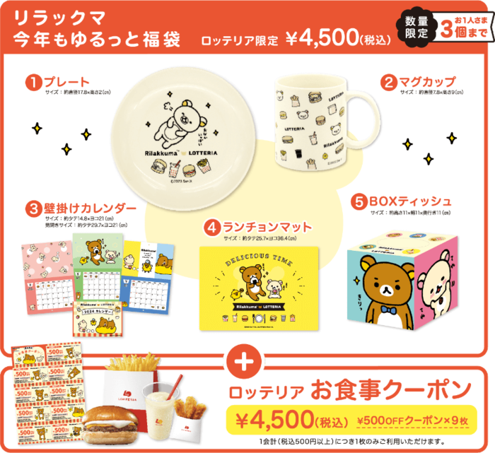 気になる内容ですが、リラックマたちやロッテリアのハンバーガー・ポテトなどのイラストを採用したお食事タイムにぴったりな陶磁器製の「プレート」と「マグカップ」に加え、毎月異なる「リラックマ」のデザインを楽しめる「壁掛けカレンダー」、食卓を華やかに彩る「ランチョンマット」、カラフルな色合いの「BOX ティッシュ」の5アイテムがセットに。さらに、福袋金額分の「ロッテリア お食事クーポン」4500円分が付いたお得なセットとなっています。