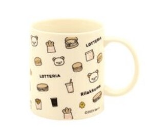 「リラックマ」とロッテリアのハンバーガーやポテトなどの総柄デザインがおしゃれな陶磁器製マグカップです。柔らかなオフホワイトの色味で、毎日使いたくなりそうですね。