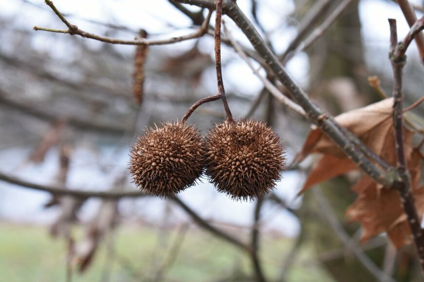 紅葉が美しい落葉高木で、街路樹としてよく見かけるスズカケノキ。秋になるとコロンとした球形の実がぶら下がります。トゲがピンピン生えたようなフォルムがユニークです。※参考価格:3000~4000円前後(3号ポット苗)