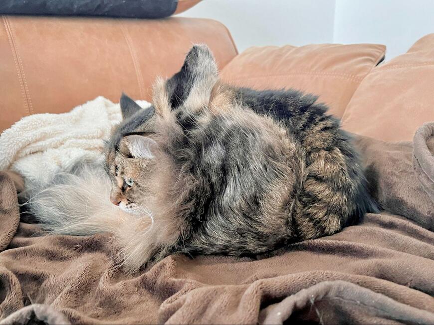 写真に写るヤマネコくんは座って横を向いているようですが、パッと見ただけではどんな体勢になっているのか理解することが難しいです。顔の前にモフモフの毛があり、背中は丸まっている様子。