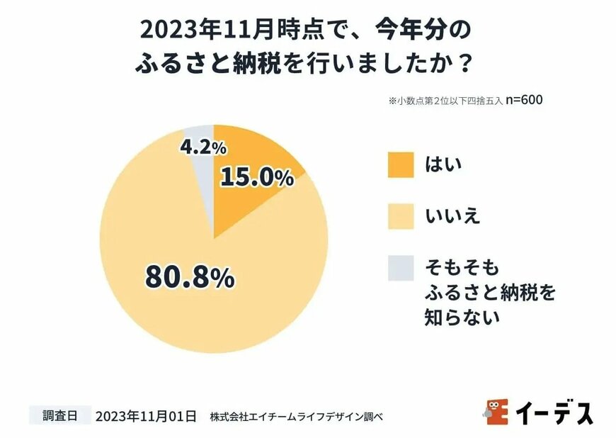 上記調査の結果、11月1日時点で80.8%の人が「ふるさと納税を行っていない」と回答しました。