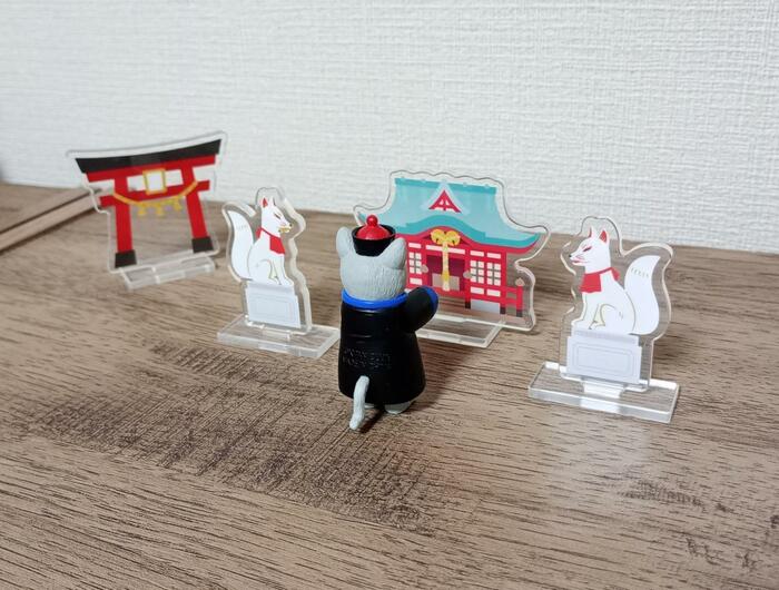 カプセルトイやミニフィギュアと飾ってもかわいいです。5cmくらいの高さのフィギュアなら、参拝しているような雰囲気を出すことも可能です。