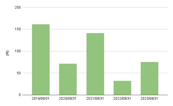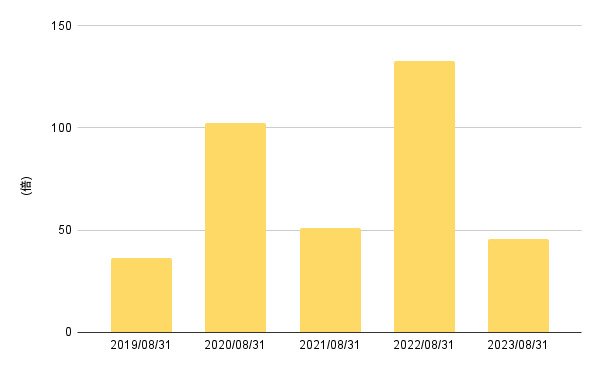 投資活動にともなうキャッシュの収支を示す投資キャッシュフローは前年比+400万円の▲38億4900万円でした。
