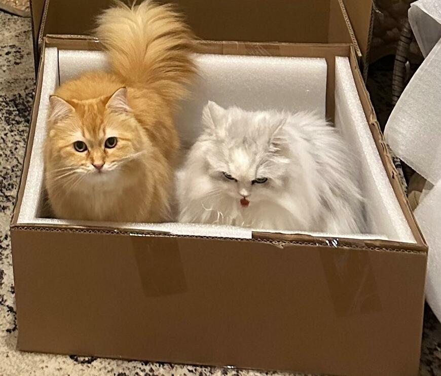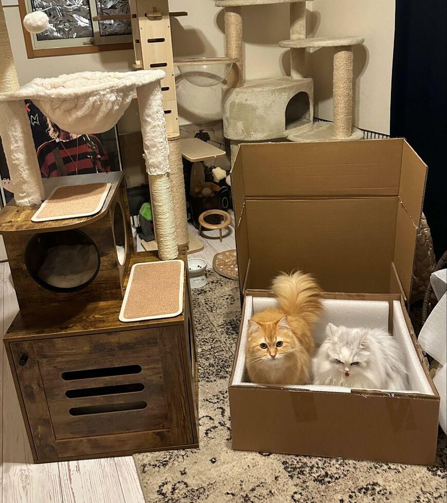 写真左側には、組み立てが終了した「立派なキャットタワー」が写っていますね。そしてその隣を見ると……?段ボールの中に、エマちゃんとノーマンくんがちょうどよく収まっています。