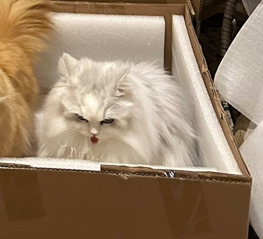 投稿には「かわいい!」「右の猫ちゃんの顔が……笑」「猫って段ボール好きですよね」などのコメントが続出しました。