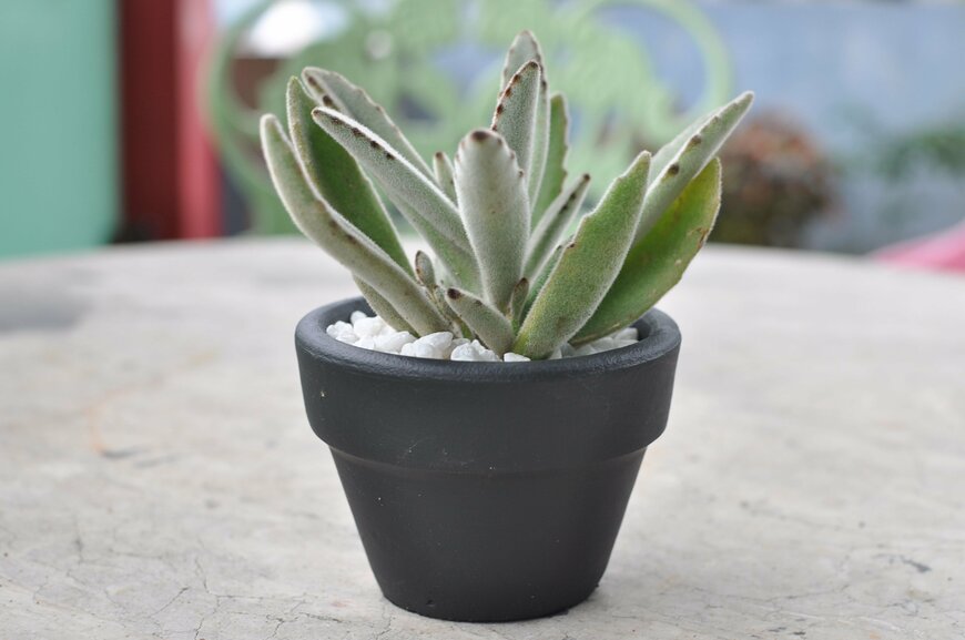カランコエ属の月兎耳(つきとじ)は、まるでウサギの耳のようなフワフワした毛が生えた多肉植物です。葉の形も兎の耳のようで、葉先に茶色の斑点があります。