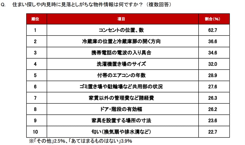 アットホームに加盟する全国の不動産会社に住まい探しや内見時に見落としがちな物件情報を聞いたところ、「コンセントの位置、数」「冷蔵庫の位置と冷蔵庫扉の開く方向」「携帯電話の電波の入り具合」がトップ3でした。
