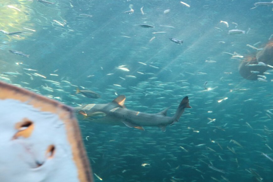 写真左下には、ひょっこりと姿を覗かせる「エイ」の姿が…。カメラ目線で見つめるエイが水族館で自撮りしているようにも見えてきます。かわいらしい姿に、思わず笑いがこぼれてしまいますね。