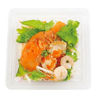 「大根とキャベツ、人参ベースのサラダに、水菜やサーモン、ホタテ、海老、とびっこをトッピングした彩り豊かな海鮮サラダです。フライドオニオンを添えて、旨味を引き出しています。」