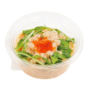 「オマールソースベースのスパゲッティサラダの上に、水菜、紅ずわいがに、とびっこをトッピングしました。クリスマスや年末年始にぴったりのご馳走感のあるサラダに仕上げました。」