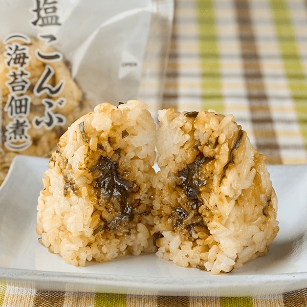 「塩昆布の旨みとごまの風味をきかせた混ぜご飯で、海苔佃煮を包んだおむすびです。※九州地方の一部では取り扱いがございません。」