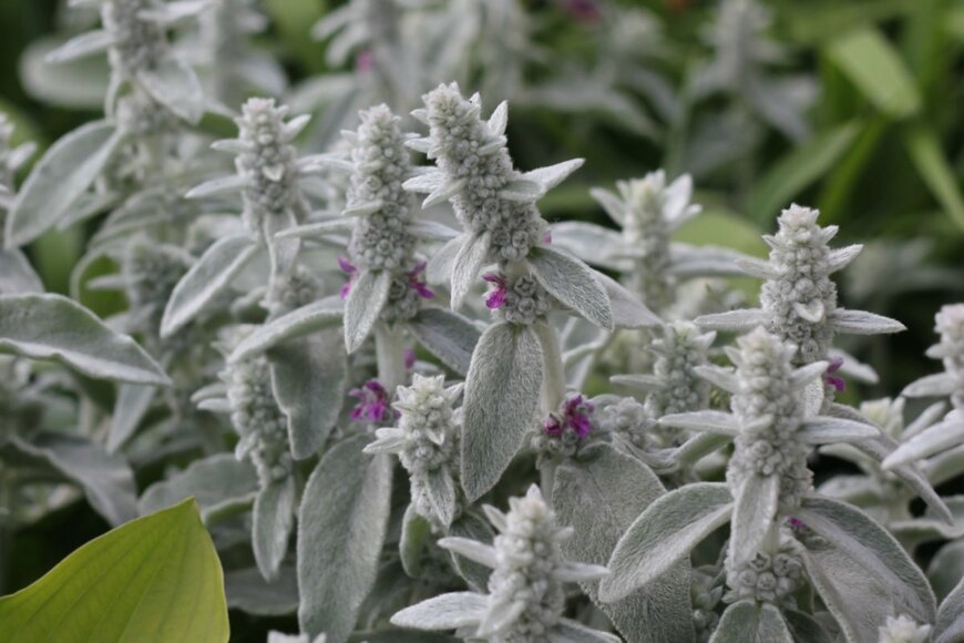 ラムズイヤーは動物の耳のようなソフトな手触りが魅力。全体が短い毛でおおわれ、光が当たると白く輝きます。初夏には太い花茎を立ち上げて咲く紫色の穂花がユニークです。※参考価格:200~300円前後(3号ポット苗)