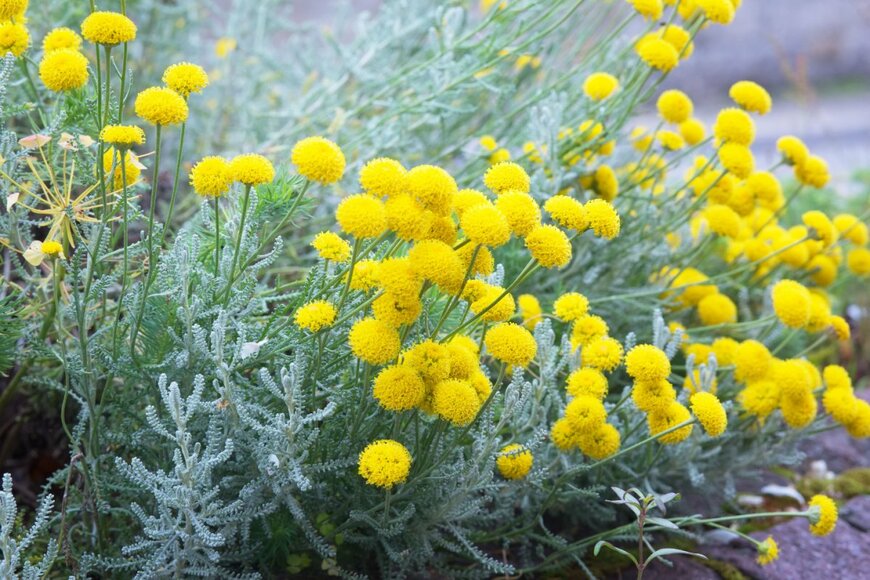 初夏に丸くてカワイイ黄色の花が咲くサントリナ。ハーブの一種で爽やかな香りを持ち、細かい切れ込みが入った葉が珊瑚のようにキレイです。ドライフラワーにしてリースやポプリにもよく利用されています。※参考価格:200~300円前後(3号ポット苗)