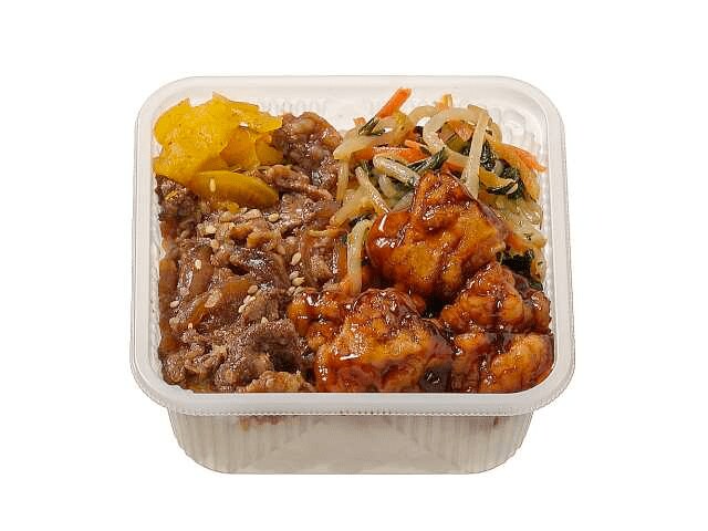「人気の牛焼肉とピリ辛ダレを和えた唐揚げを組み合わせた一膳タイプのお弁当です。」