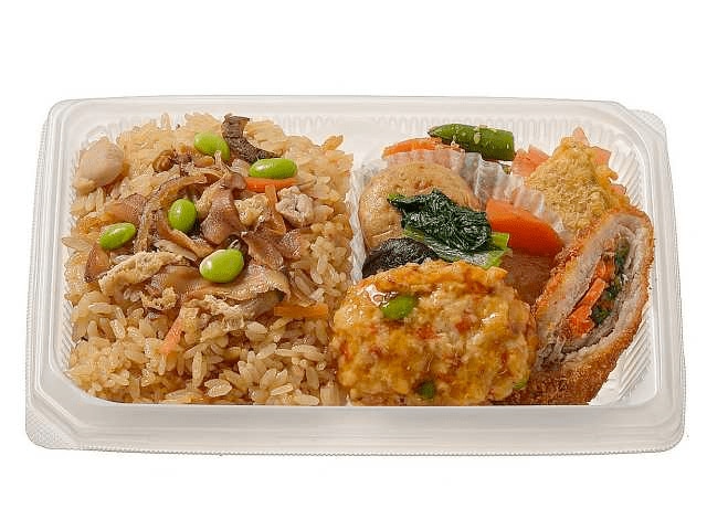 「チキンライスとデミハンバーグ、コロッケなど5種の洋風おかずで仕立てた幕の内弁当です。」
