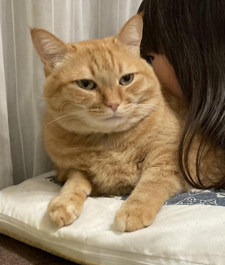「猫吸いされているときに照れ隠しの真顔になるのおもろい」というコメントとともに投稿されたのは、一枚の写真でした。