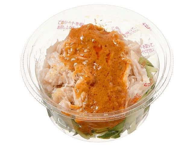 「「赤坂四川飯店」監修のカップデリです。食べ応えのある蒸し鶏と食感の良いきゅうりと本格的なバンバンジーのタレで一緒に召し上がっていただく仕立てです。」