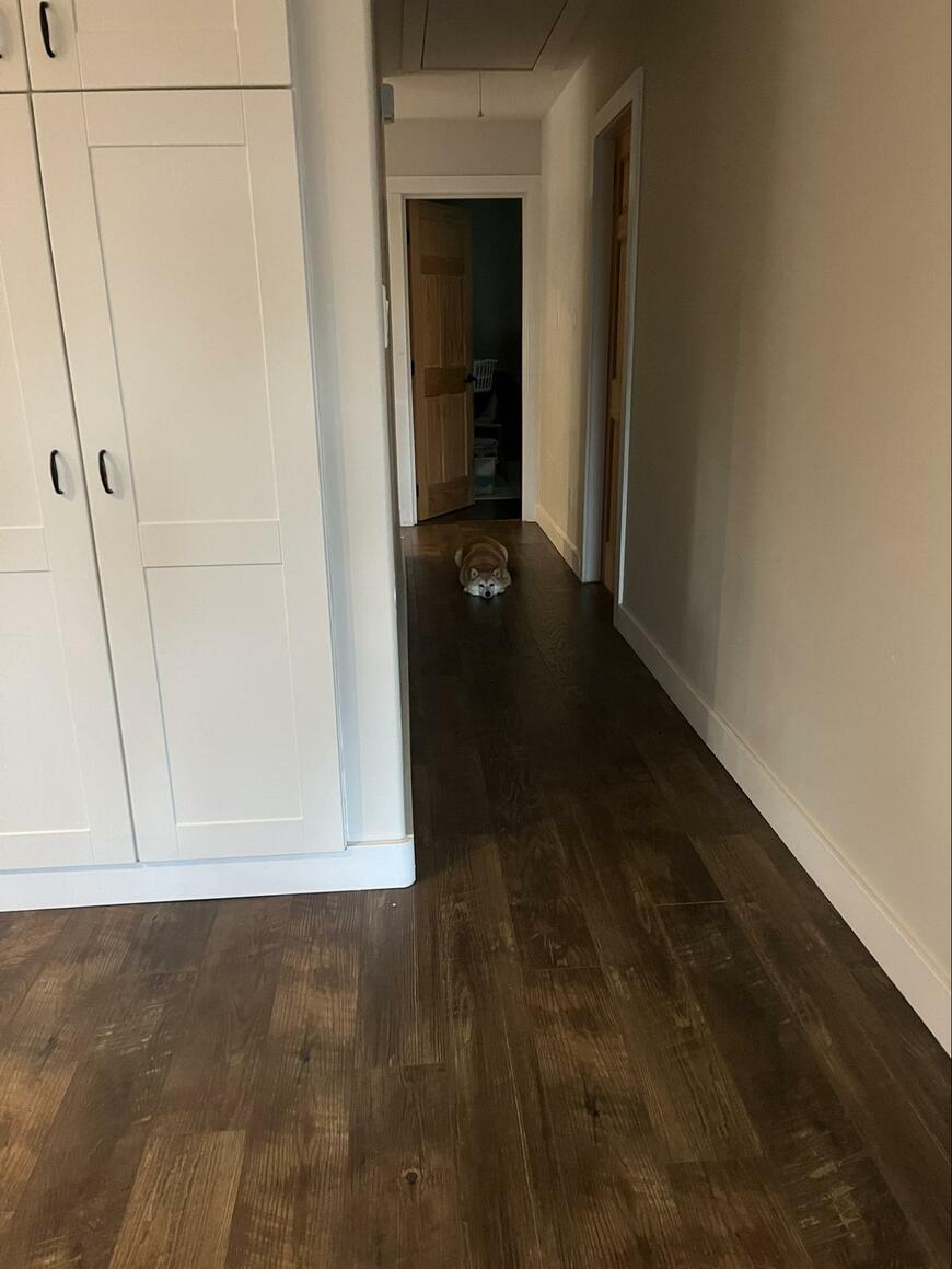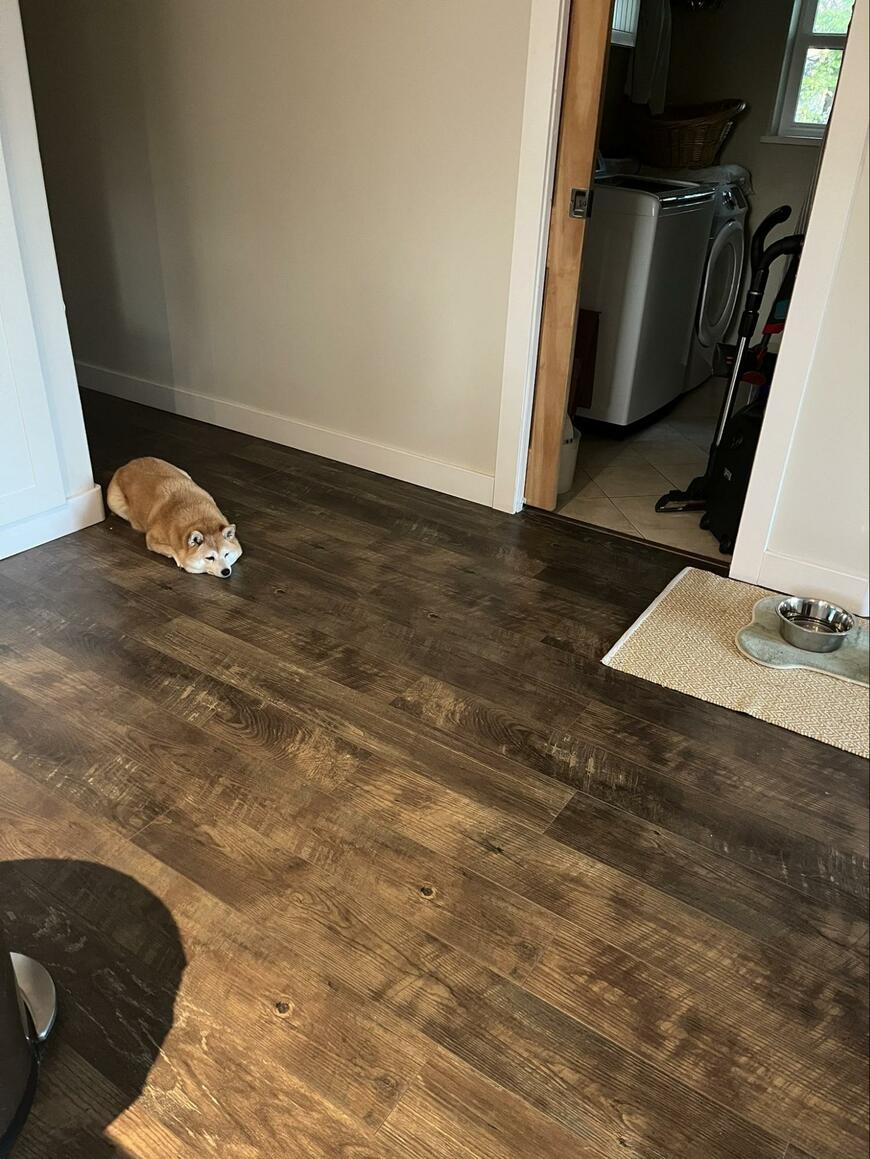 そこに収められていたのは、同じ体勢で少しずつごはんの皿に近づく柴犬の姿。最初は廊下の端にいた柴犬は、少しずつごはんの皿との距離を縮めていきます。