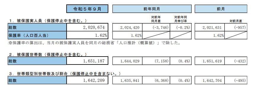 厚生労働省が2023年12月6日に発表した「生活保護の被保護者調査」によると、2023年9月の被保険世帯数は165万1187世帯でした。