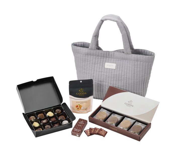 「2024 ニューイヤー ハッピーバッグ」は、ショッピングやジム通いにも便利に利用できるオリジナルバッグに、チョコレートのアソートメントや焼き菓子などをバリエーション豊かに詰め合わせたセットです。どのバッグにもゴディバの人気商品や気になるチョコレートが入っているので、ちょっぴり贅沢なお正月を彩るアイテムとして活躍してくれそうです。