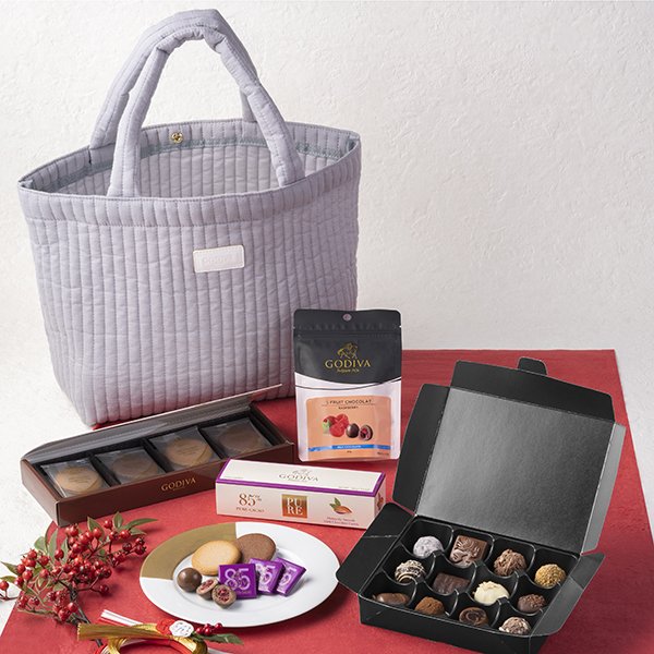- セット内容:2024 ニューイヤー ハッピーバッグ オンラインショップ限定 アソートメント 12粒入、ゴディバ ピュア 85% ダークチョコレート カレ、G フルーツショコラ ラズベリー、ラングドシャクッキーアソートメント (8枚入)、2024 ニューイヤー ハッピーバッグ オンラインショップ限定クーポン(封筒入り)、ゴディバ オリジナルバッグ