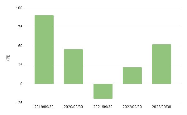 1株あたりの利益額を示すEPSは52円(端数切り捨て)。