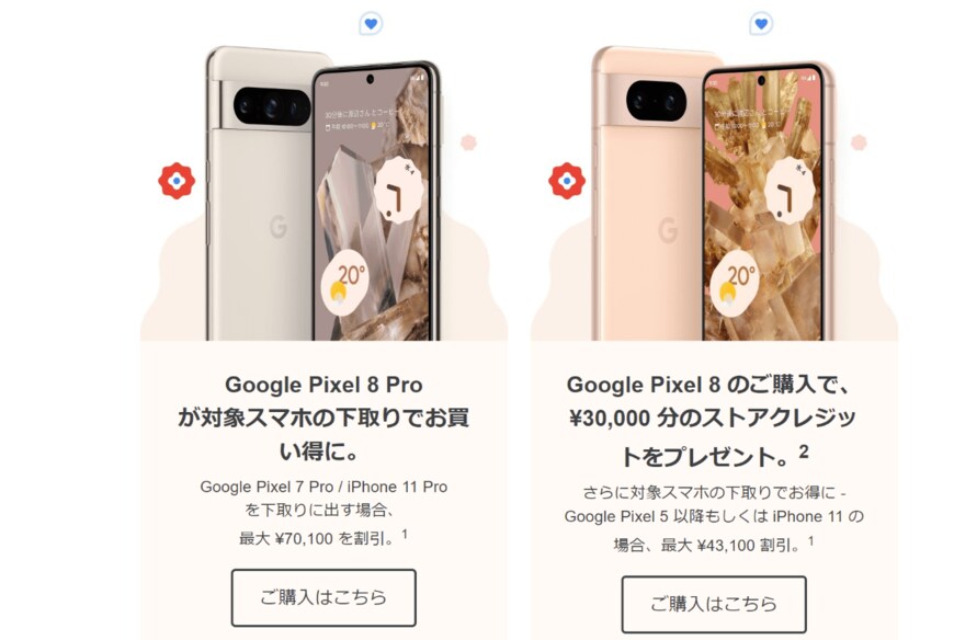 「ブラックフライデーセール」(こちらを参照)同様に、「Pixel 8」がお得になっている。